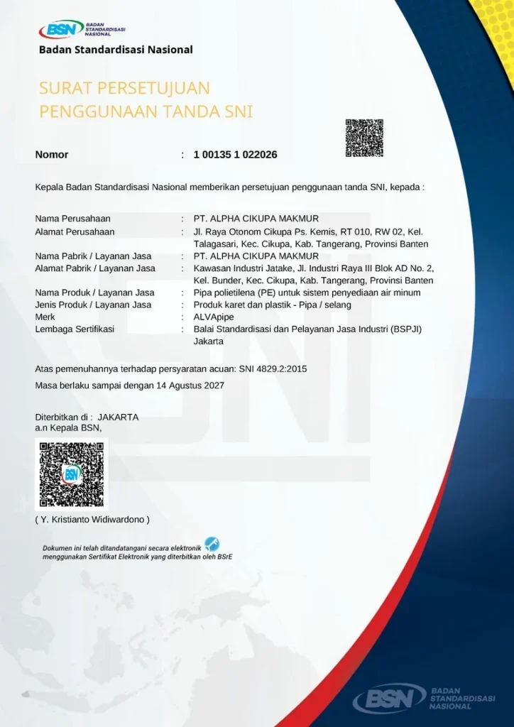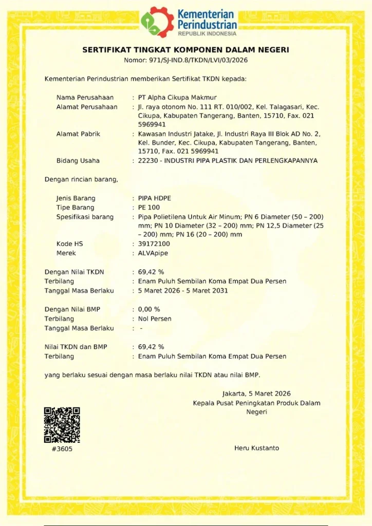Pastikan kelancaran dan keamanan distribusi air Anda dengan pipa HDPE berstandar SNI yang terbukti tahan lama. Mari bangun kemitraan jangka panjang yang menguntungkan bersama ALVApipe.